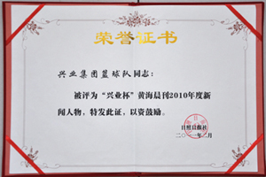 ·2011年2月,興業(yè)集團(tuán)藍(lán)球隊被評為“興業(yè)杯”黃海晨刊2010年度新聞人物,特發(fā)此證,以資鼓勵