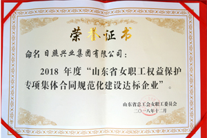 2018年12月,山東省總工會授予日照興業(yè)集團“2018年度山東省女職工權益保護專項集體合同規(guī)范化建設達標企業(yè)”