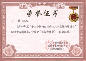 · 2004年2月,授予丁杰董事長“爭當(dāng)中國特色社會(huì)主義事業(yè)優(yōu)秀建設(shè)者”