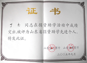 · 2005年9月,丁杰董事長榮獲“山東省捐資助學(xué)先進(jìn)個(gè)人”榮譽(yù)稱號(hào)