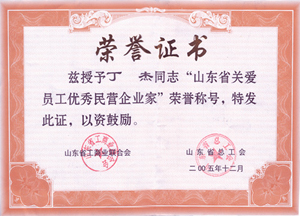 · 2005年12月,丁杰董事長榮獲“山東省關(guān)愛員工優(yōu)秀民營企業(yè)家”榮譽(yù)稱號(hào)