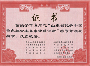 · 2007年12月,丁杰董事長榮獲“山東省優(yōu)秀中國特色社會(huì)主義事業(yè)建設(shè)者”榮譽(yù)稱號(hào)