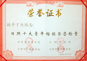 · 2009年4月,丁杰董事長榮獲“日照楷模十大青年”榮譽(yù)稱號(hào)