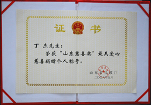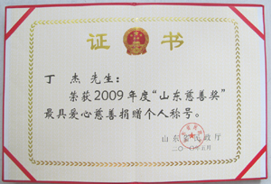· 2009年5月,丁杰董事長榮獲“山東慈善獎(jiǎng)”最具愛心慈善捐贈(zèng)個(gè)人榮譽(yù)稱號(hào)
