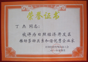 · 2010年4月,丁杰董事長榮獲“日照經(jīng)濟(jì)開發(fā)區(qū)推動(dòng)勞動(dòng)關(guān)系和諧優(yōu)秀企業(yè)家”榮譽(yù)稱號(hào)