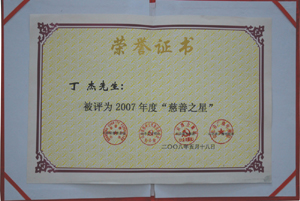 · 2008年5月,丁杰董事長榮獲“2007年度慈善之星”榮譽(yù)稱號(hào)