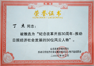 · 2008年12月,丁杰董事長被評(píng)為“紀(jì)念改革開放30周年風(fēng)云人物-推動(dòng)日照社會(huì)經(jīng)濟(jì)發(fā)展的30位風(fēng)云人物”