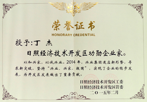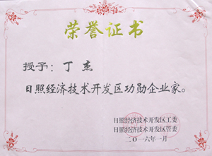 ·2015年2月,日照經(jīng)濟(jì)技術(shù)開發(fā)區(qū)授予丁杰董事長“日照經(jīng)濟(jì)技術(shù)開發(fā)區(qū)功勛企業(yè)家”稱號(hào)。
