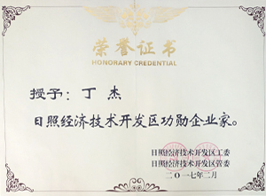 ·2017年2月,日照經(jīng)濟(jì)技術(shù)開發(fā)區(qū)授予丁杰董事長“日照經(jīng)濟(jì)技術(shù)開發(fā)區(qū)功勛企業(yè)家”稱號(hào)。