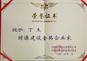 ·2020年1月,日照經(jīng)濟(jì)技術(shù)開發(fā)區(qū)授予丁杰“財(cái)源建設(shè)金獎(jiǎng)企業(yè)家”